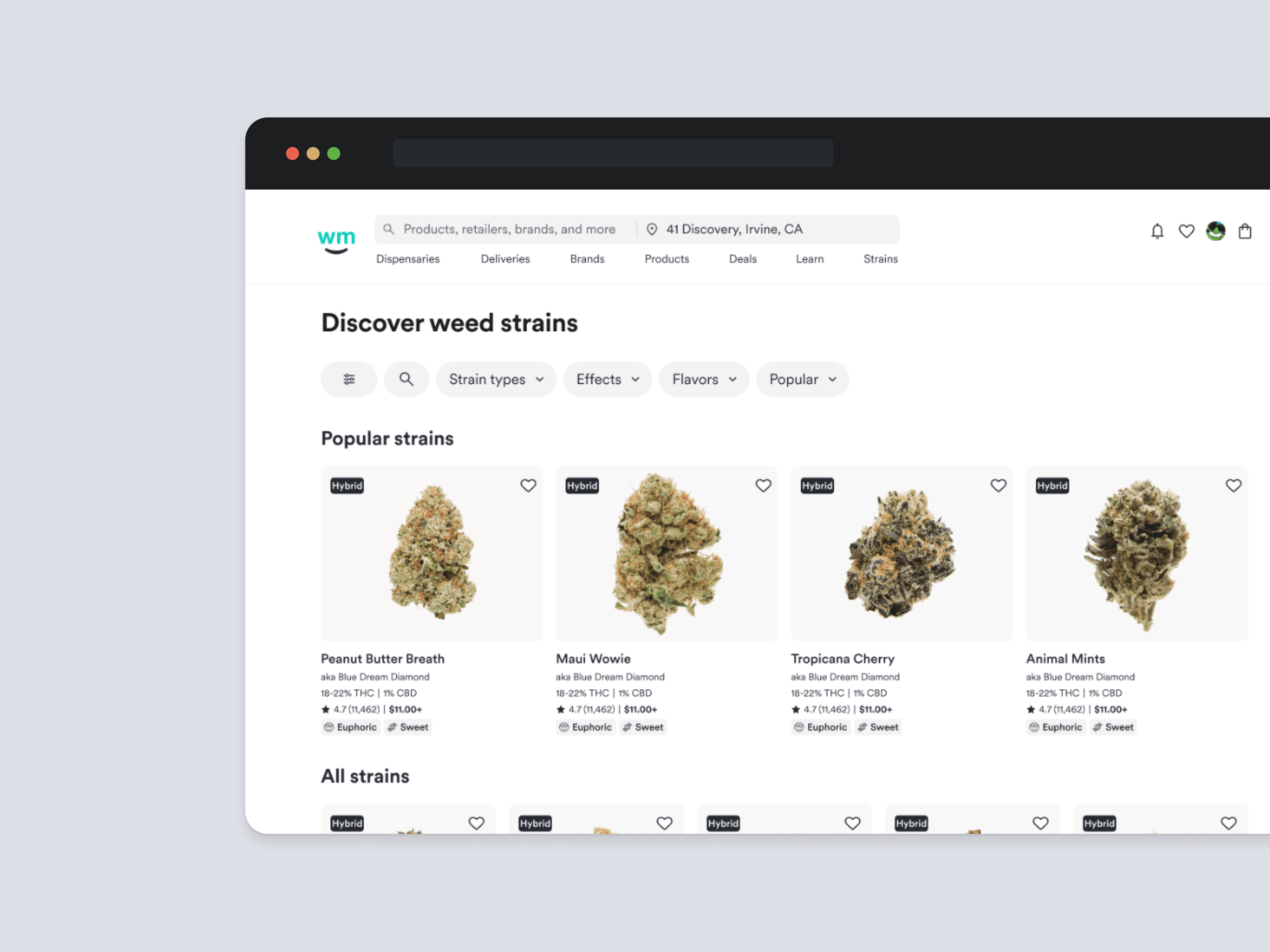 Weedmaps is a consumer marketplace used by millions of people to discover cannabis products across dispensaries nationwide. Strains are a critical entry point into the shopping experience, but the existing experience struggled to support informed decision-making, personalization, and scale. This project focused on redesigning the strains experience to improve discoverability, clarity, and confidence for users while aligning with business goals around engagement and conversion.